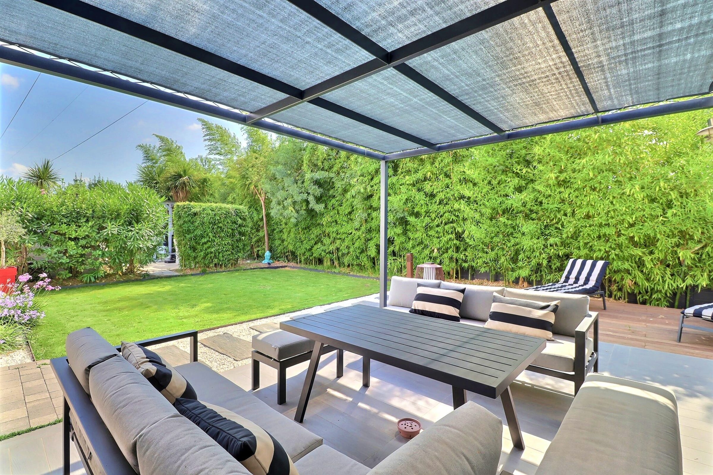 Profitez d’une grande terrasse aménagée avec une table repas, ainsi qu’un salon de jardin. Cet espace est idéal pour savourer un repas en plein air ou simplement se relaxer sous le soleil.