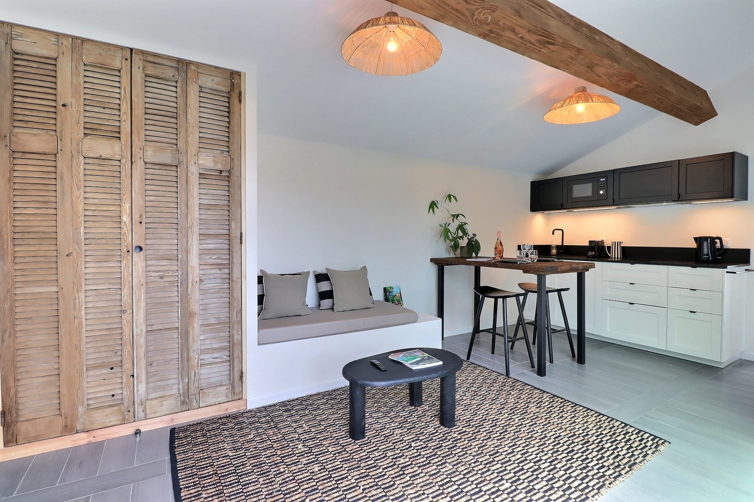 La chambre indépendante, climatisée, offre un lit double en 160x 300 cm, avec un grand dressing pour ranger toutes vos affaires. La salle de bain moderne dispose d’une douche à l’italienne, de serviettes de bain incluses, d’un WC suspendu et d’un sèche-serviettes design pour votre confort. Vous trouverez également une machine à laver, un étendoir à linge, une planche à repasser et un fer à repasser à votre disposition.
