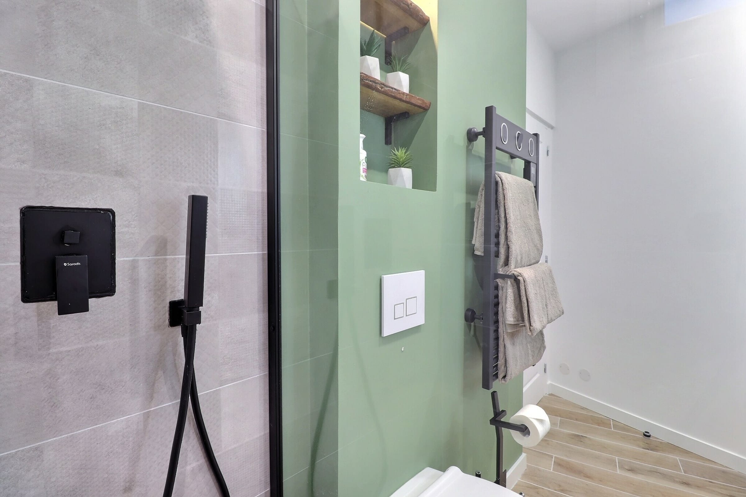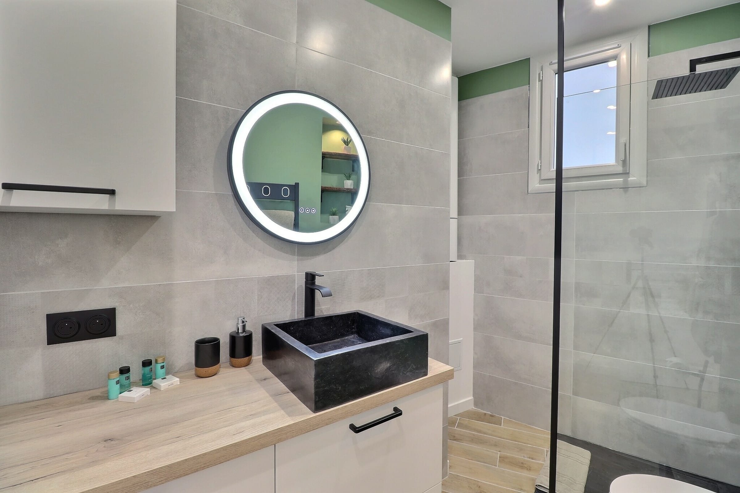 La salle d’eau moderne est dotée de tout le confort nécessaire : douche à l’italienne spacieuse, meuble vasque en marbre, WC suspendu, lave-linge, sèche-serviettes et nombreux rangements.