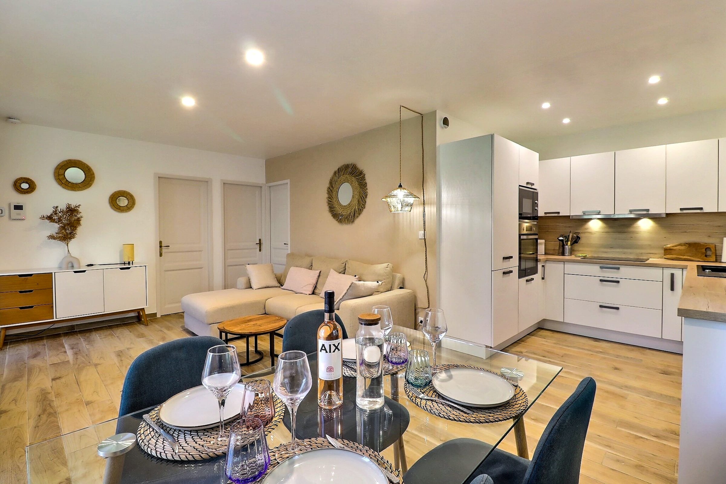 Dès votre arrivée, le salon-séjour vous invite à la détente avec un canapé spacieux 4 places, une table basse et une télévision connectée murale pour des soirées cosy. La cuisine ouverte, de grande qualité, est entièrement équipée pour répondre à tous vos besoins : plaque vitro céramique 4 feux, four, micro-ondes, machine à café, grand réfrigérateur-congélateur, bouilloire, ustensiles de cuisine et vaisselle pour 6 personnes. La climatisation réversible, présente dans le salon, garantit un confort optimal, quelle que soit la saison.