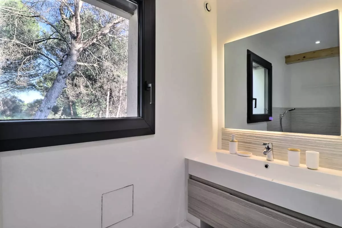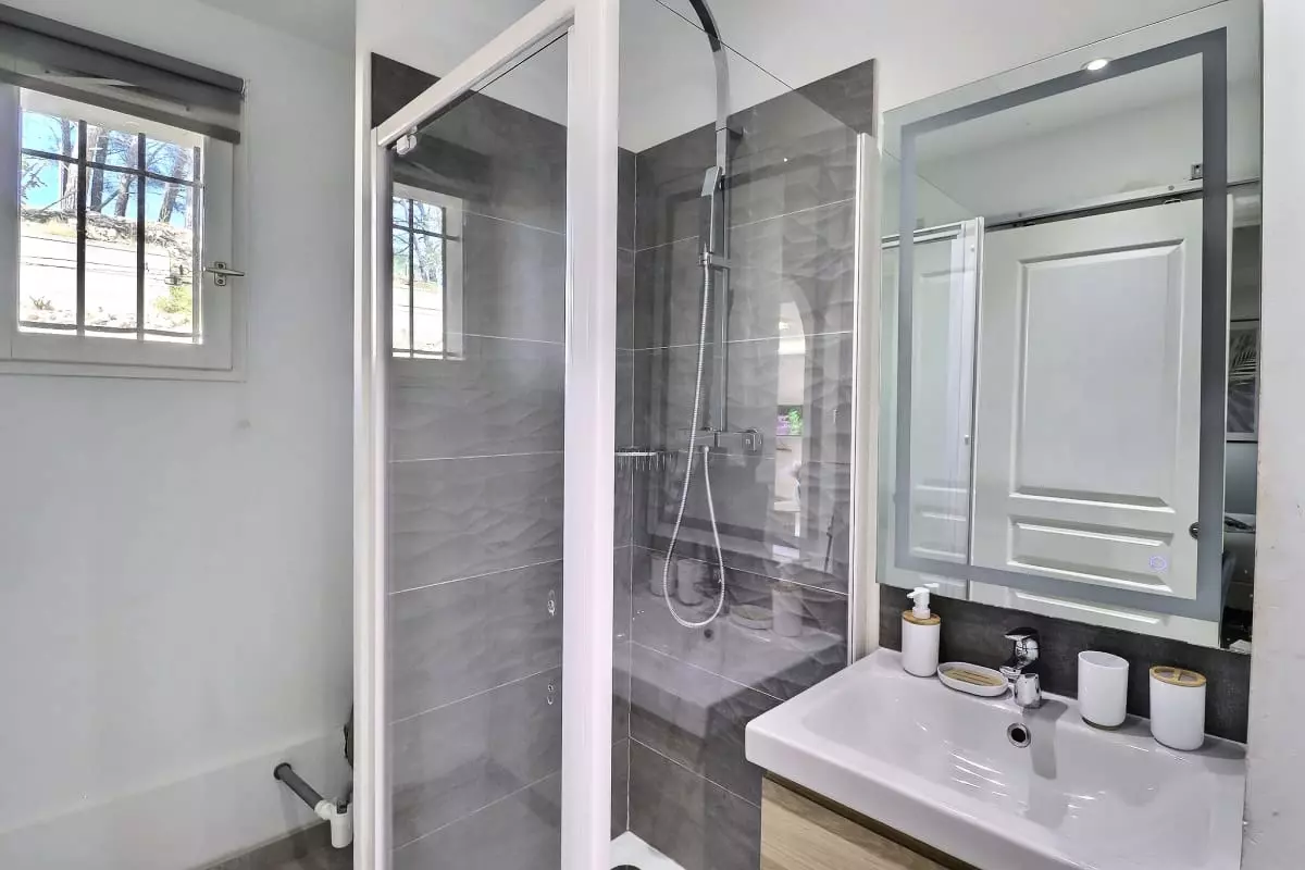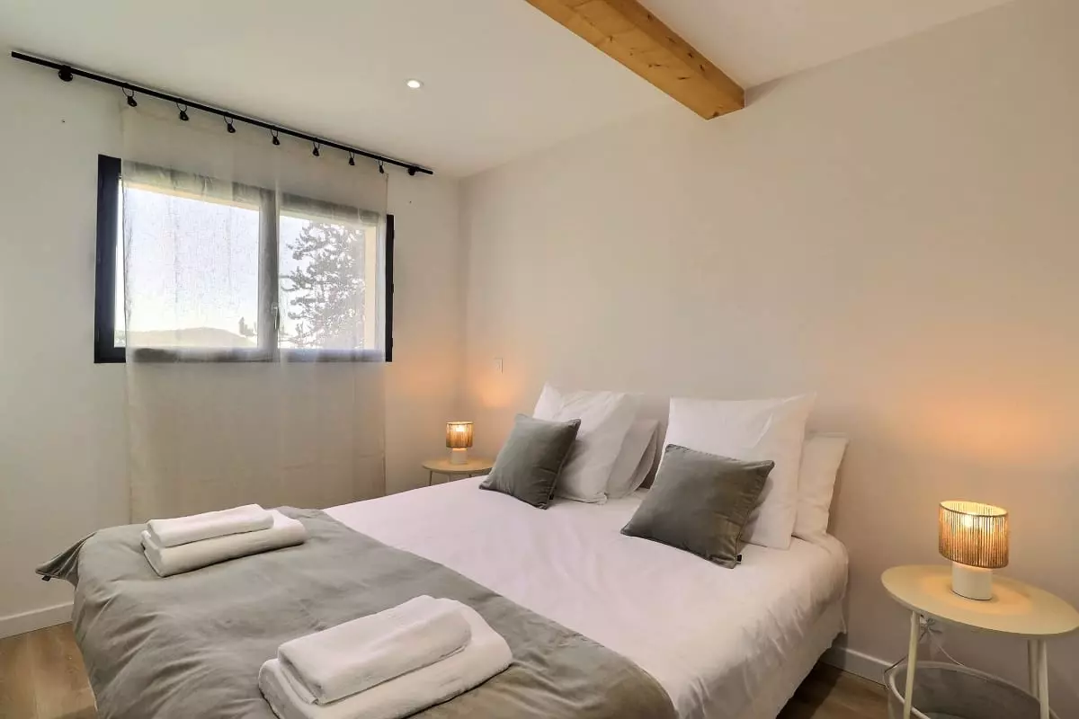 La villa se compose de cinq chambres, dont une dépendance indépendante aménagée en véritable suite privée, avec sa propre salle d’eau et une terrasse intime, parfaite pour garantir autonomie et tranquillité à ses occupants. Située en léger contrebas, cette dépendance est proche d’une petite route où circulent quelques véhicules, ce qui peut occasionner une légère nuisance sonore à certains moments de la journée.