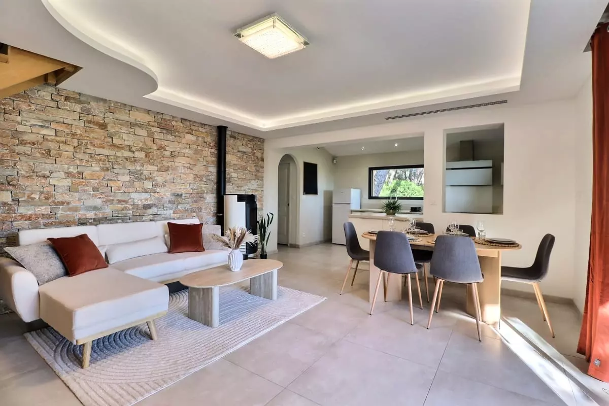 Dans la maison principale, le salon lumineux, la cuisine ouverte entièrement équipée et l’espace repas forment un vaste espace de vie convivial, tourné vers le jardin et la piscine à débordement. L’ensemble bénéficie d’une belle lumière naturelle grâce aux grandes ouvertures sur l’extérieur.